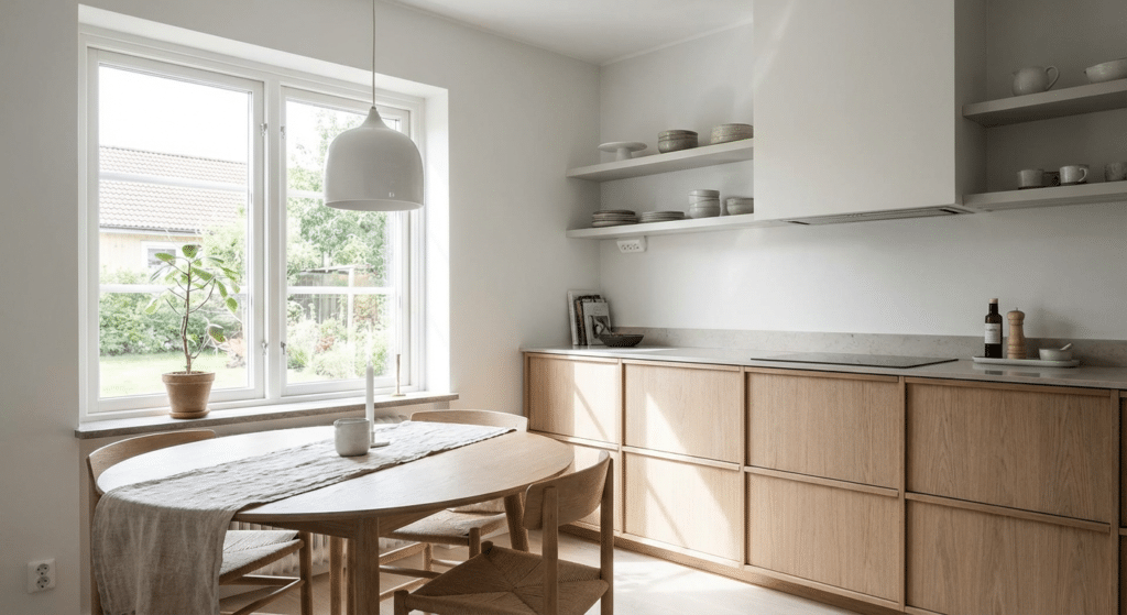 Floating shelves are a signature of Minimalist Scandinavian layout, offering display and function without bulk. In a Cozy Nordic kitchen, they free up upper cabinets for a leaner silhouette while giving you daily access to essential tools and favorite ceramics. Install at a comfortable height to reduce reaching, and mix volumes with a few sturdy boards and one or two glass jars of pantry staples. The openness invites light to travel, enhancing the sense of space. By curating what sits within reach, you create a tactile experience that’s both practical storage and a visual breath of calm.